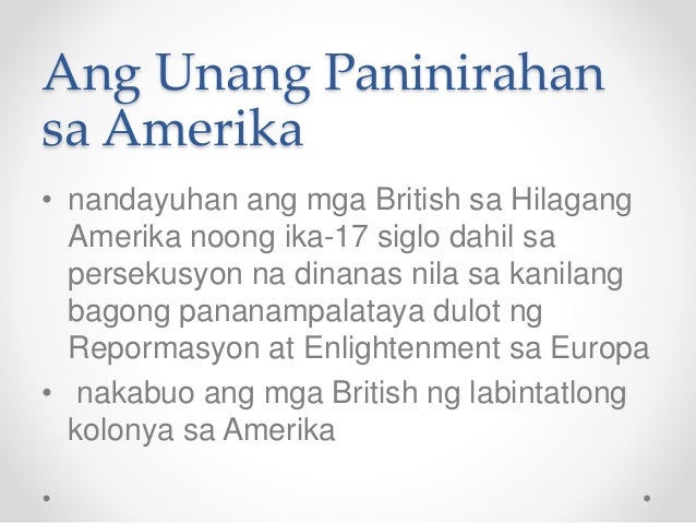 Ang Unang Paninirahan sa Amerika nandayuhan ang mga British sa Hilagang Amerika noong ika-17 siglo dahil sa persekusyon na dinanas nila sa kanilang bagong pananampalataya dulot ng Repormasyon at Enlightenment sa Europa nakabuo ang mga British ng labintatlong kolonya sa Amerika 4. Bagamat parehong may ebidensyang ipinakikita ang dalawang teorya pareho din namang may hindi matatag na ebidensya ang mga ito. Maysa A Kanditato ni Mena Pecson Crisologo noong 1908.