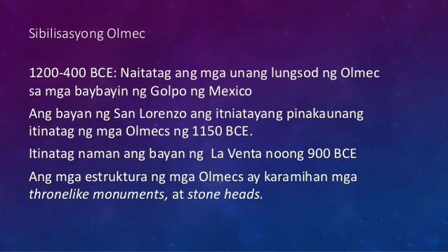 Mesoamerika -Olmec -Toltec -Zapotec -Maya -Aztec 2. Ang tawag sa mga unang guro sa Pilipinas sakay ng barkong SS Thomas10. Dito naitatag ang unang paninirahan ng tao at isa ito sa mga lugar na unang pinag-usbungan ng agrikultura tulad ng Kanlurang Asya at China.