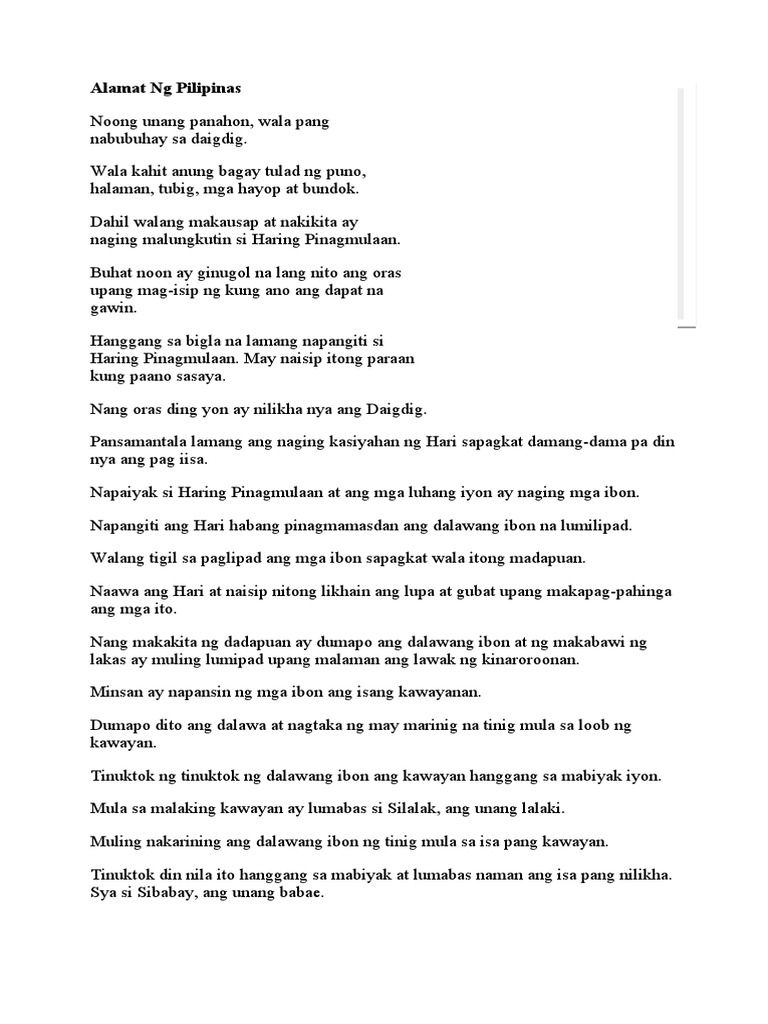 Alamat ng pinagmulan ng pilipino. Isang ibong ang pinagaway ang langit. Dati ang mga tao walang palay. Mayroon lamang maliliit na mga pulo.
